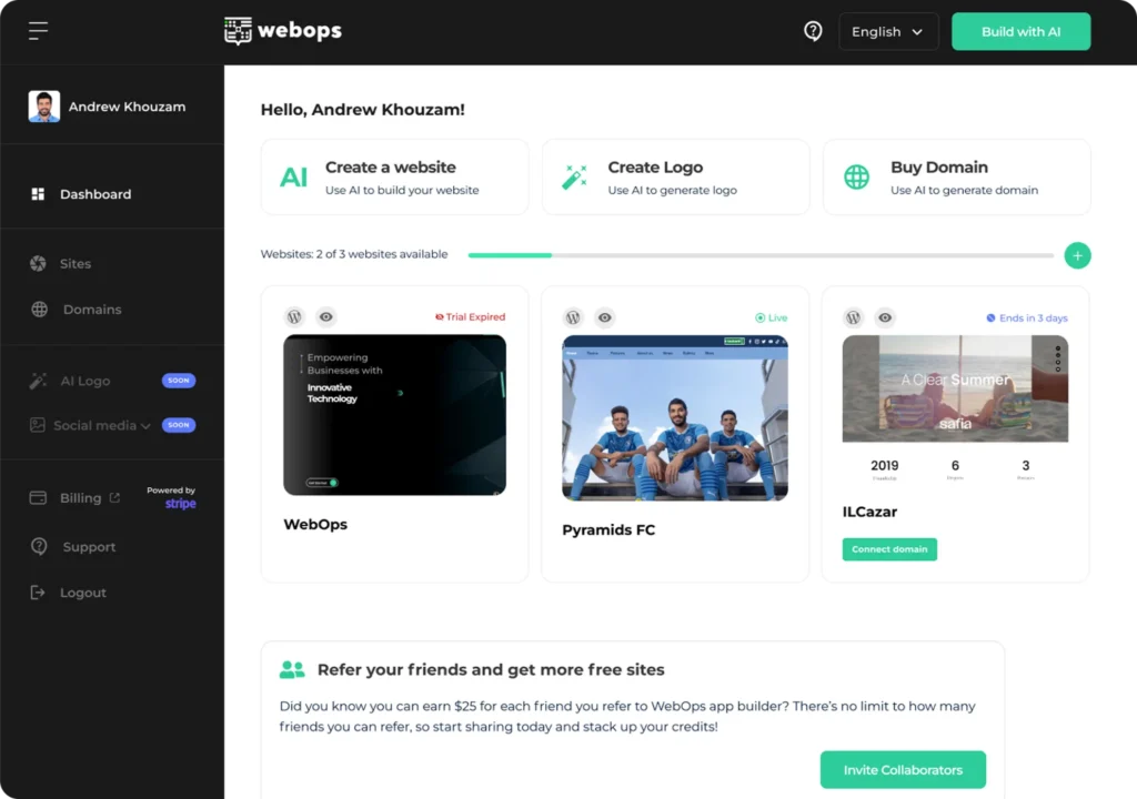 انضم لبرنامج الأفلييت WebOps، واكسب وانت بتساعد الناس يعملوا مواقعهم بالـ AI Builder — بسيط، سريع، ومضمون.