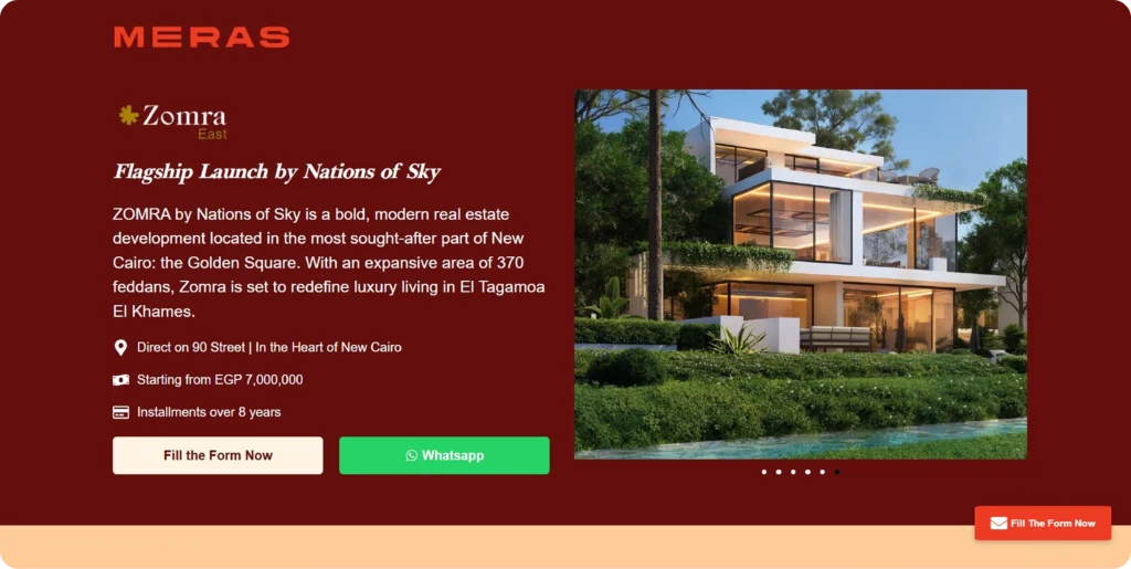 موقع Meras يعمل كمنصة رقمية راقية لعرض فرص عقارية متميزة في القاهرة. يسلّط الضوء على أبرز مميزات العقارات، وخطط الدفع المرنة، والشراكات الموثوقة في مجال التطوير العقاري—وذلك كله من خلال تصميم عصري وجذاب بصريًا.